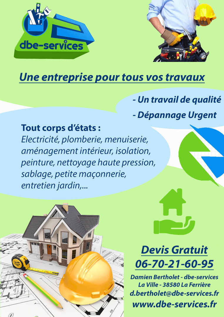 dbe-services est une structure tout corps d'états : Electricité générale, plomberie (sanitaire), rénovation salle de bain, aménagement intérieur ( rangement sur mesure, pose de cuisine , pose de ridaux, fixation étagères, montage de meuble,... ), montage de cloison (Placo, carreaux platre, béton celullaire, bois), menuiserie (parquet, plancher, bardage, lambris bois et pvc, ...), isolation, pose revêtement de sol ( parquet, carrelage, lino, moquette, dalle PVC, ...), nettoyage haute-pression (mur, terrasse, toiture,...), sâblage, peinture et lasure (intérieur comme extérieur), entretien jardin, petite maçonnerie, démolition, ... bref nous savons tout faire (tout et bien en plus)!